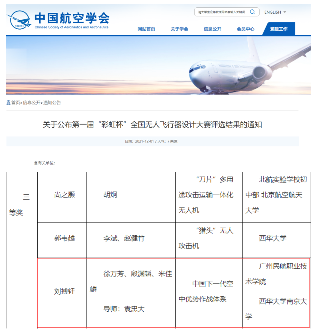经过激烈角逐,我校学生作品《中国下一代空中优势作战体系》获得团体三等奖的好成绩。指导教师为袁忠大老师,参与学生为我校飞机维修工程学院刘搏轩、米佳麟等同学,我校为第一参与单位。