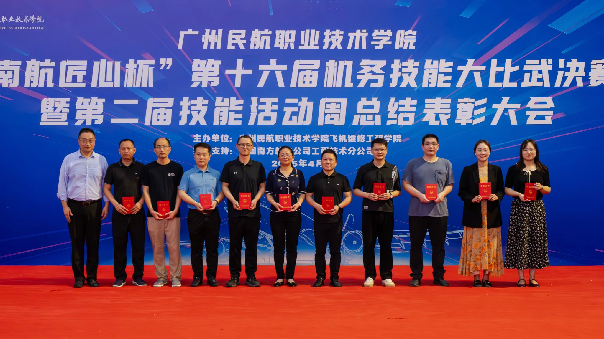 在为期一个月的激烈角逐中,民航学子们展现出令人瞩目的专业素养。机务技能大比武现场,参赛团队在模拟航空器排故环节精准操作,力矩扳手的咔嗒声与工卡核对的口令声此起彼伏;飞机指挥操比赛中,学生化身“航空指挥官”,标准手势与灯光信号配合娴熟,再现了白云机场塔台的真实工作场景;未来飞机设计赛项则涌现出多组融合新能源技术与智能航电系统的创新方案,彰显了民航新生代的科技想象力。最终,本届技能活动周活动共评选出24名学生获得一等奖,45名学生获得二等奖,65名学生获得三等奖,邓君香、周倩雯、吴成宝等28名老师获得优秀指导老师奖,在闭幕式上分别举行了颁奖仪式。