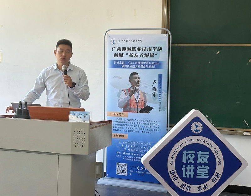 作为2008届飞机机电设备维修专业的杰出校友,卢海军围绕“以工匠精神护航万里云天 新时代民航人的使命与追求”这一主题,从民航工匠精神的内涵、民航工匠精神的传承、平凡岗位上的非凡匠心三个方面,围绕民航安全主线,结合个人学习成长历程、民航行业工作经验以及给在校学生学习和职业规划建议,通过案例分享,为师生们带来了宝贵的职业指引和人生启发。他表示,毕业后始终铭记母校的培育和教导,在工作岗位上兢兢业业,扎扎实实走好每一步,在岗位上实现了自我成长,职业生涯获得飞跃,成长为东方航空技术有限公司江苏分公司航线维修一部副经理,高级工程师,先后荣获了江苏省五一劳动奖章、江苏工匠、全国交通技术能手,全国五一劳动奖章,领衔创建的“卢海军飞机维修技术创新工作室”被中国民航工会命名为第六批全国民航劳模和工匠人才创新工作室。他鼓励学弟学妹们要脚踏实地学真本领,立足当下扎实学知识,专业知识技能是做好岗位工作关键,珍惜实训机会,融合知识与实践,储备知识提升素养;要坚持不懈创佳绩,树立正确信念与价值观,注重团队协作、潜心钻研、勇挑重担,增强抵御生活和社会风险的能力。