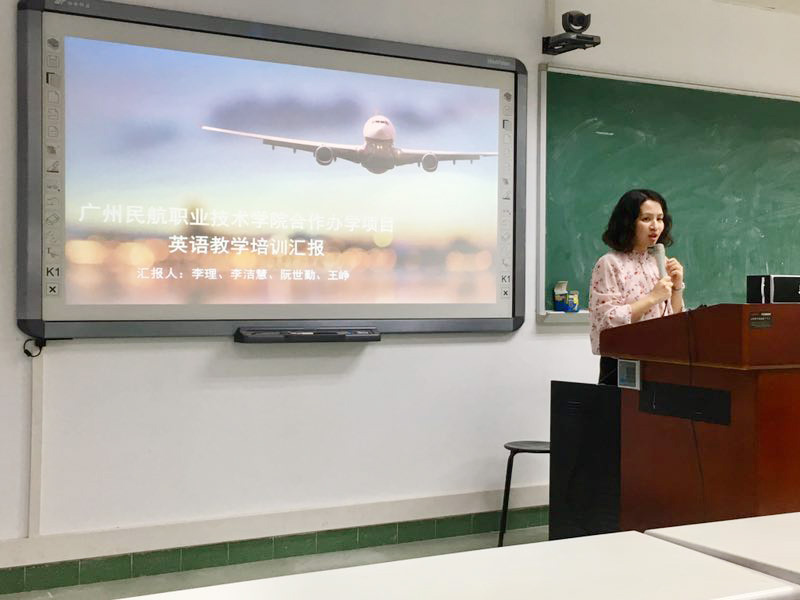 李理老师代表英语教学部四名教师,从基本情况、培训内容、培训收获、思考建议四个方面,介绍了团队在加拿大卡纳多学院为期28天的英语教学培训中的所学、所见、所闻和所感。通过此次学习培训,四位老师深入了解了中加两国教学体系的差异,并就如何在差异化环境下开展相辅相成的教学进行了大量探讨;并与卡纳多学院的语言教师、机务专业教师们建立了良好的学习合作关系,为今后的信息共享、教学互通打下了基础;深刻体会到了要从更新教学理念、增强服务意识、加强语言室建设、提高信息化水平、科学开展英语教学和着力培养学生安全意识等方面提升教学效果。