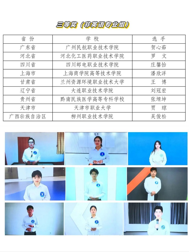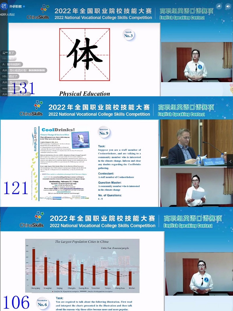 9月26日至28日,2022年全国职业院校技能大赛高职组英语口语赛项以“线上参赛监赛,线下集中评审”的方式举行。作为省赛非英语专业组别一等奖获得者,我校2020级民航电子商务1班贺心茹同学代表广东省与来自全国各省、自治区、直辖市和新疆生产建设兵团的29位非英语专业组选手云端竞技,经过“中国故事”“情景交流”“职场描述”三个竞赛环节的激烈角逐,最终获得第十名(三等奖)的优异成绩。