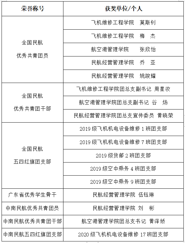 在中国共产主义青年团成立100周年之际,全国民航团委、广东团省委和广东省学联等各级团组织公布了一批受表彰名单,我校各级团组织和个人荣获多项荣誉称号。